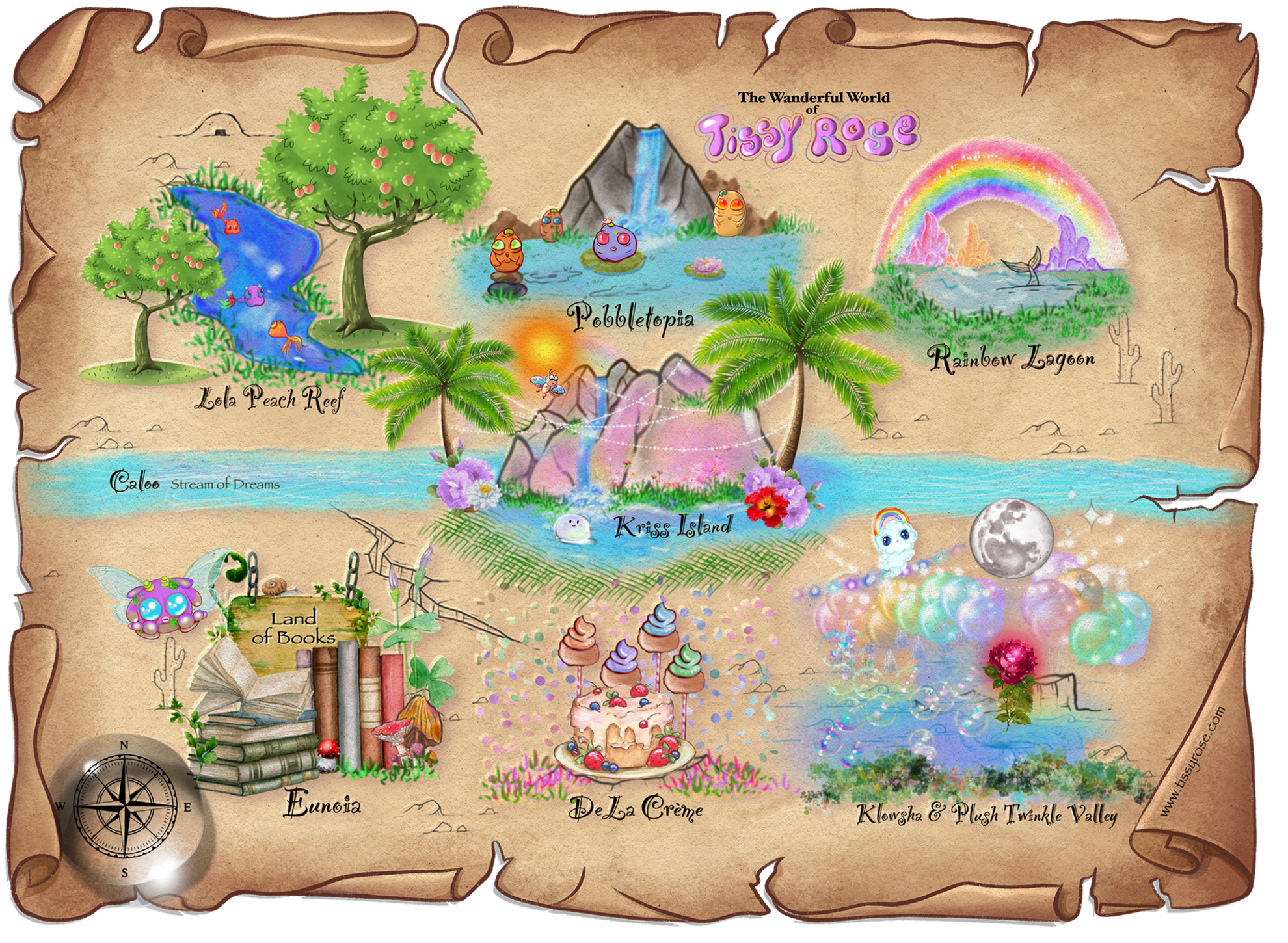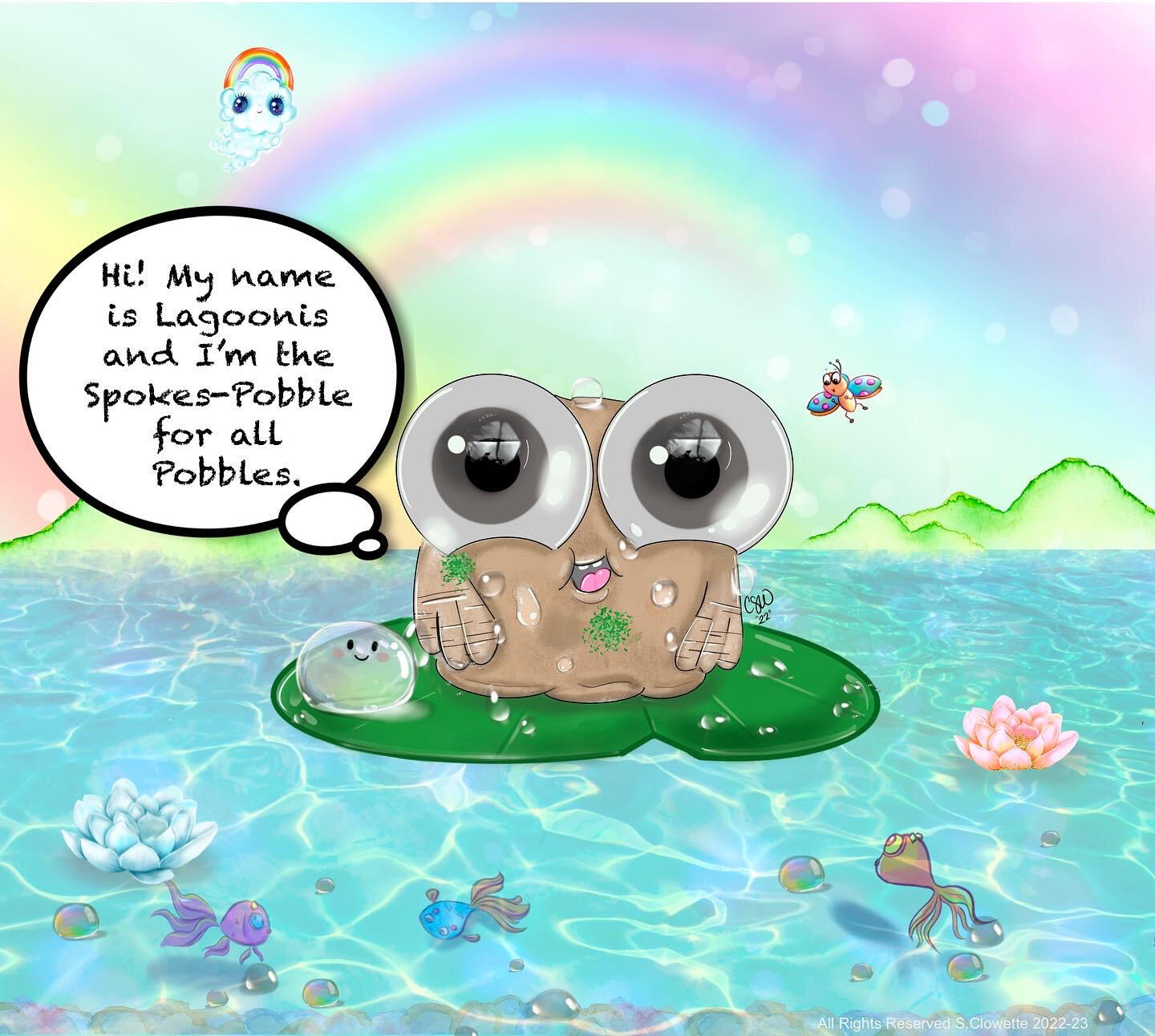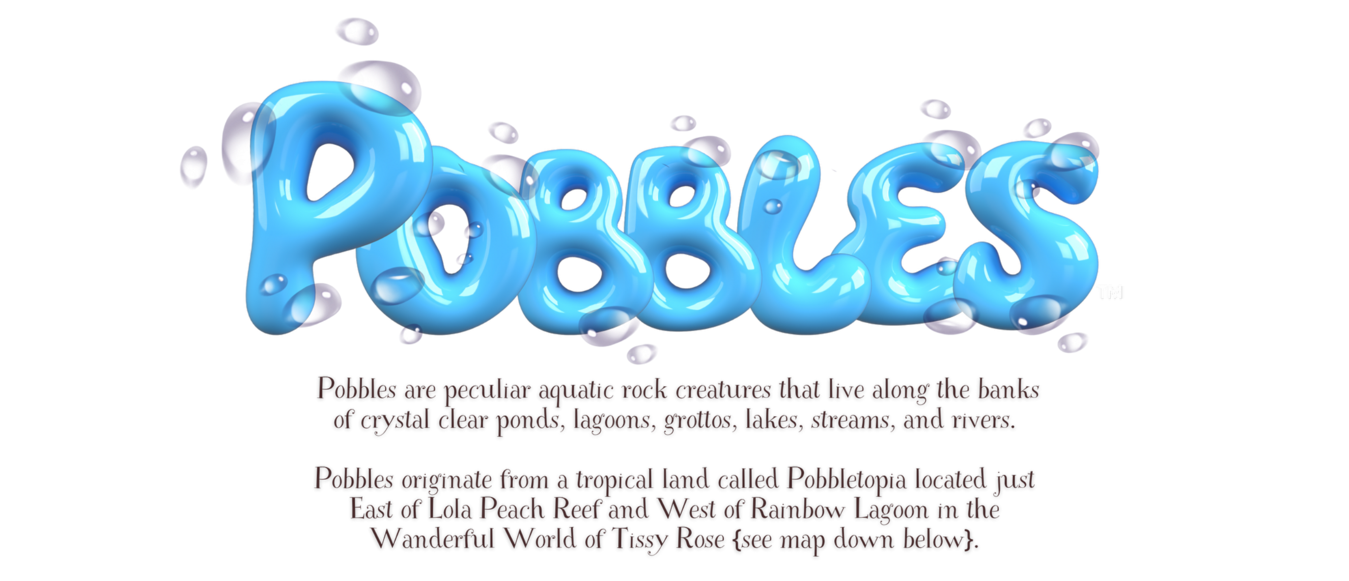Pobbles are peculiar aquatic rock creatures that live along the banks of crystal clear ponds, lagoons, grottos, lakes, streams, rivers, and other enchanting bodies of water.Pobbles originate from a tropical land called Pobbletopia located just East of Lola Peach Reef and West of Rainbow Lagoon in the Wanderful World of Tissy Rose {see map down below}.