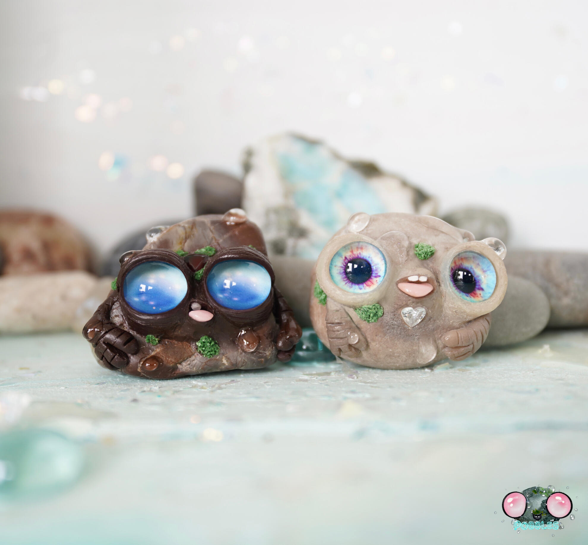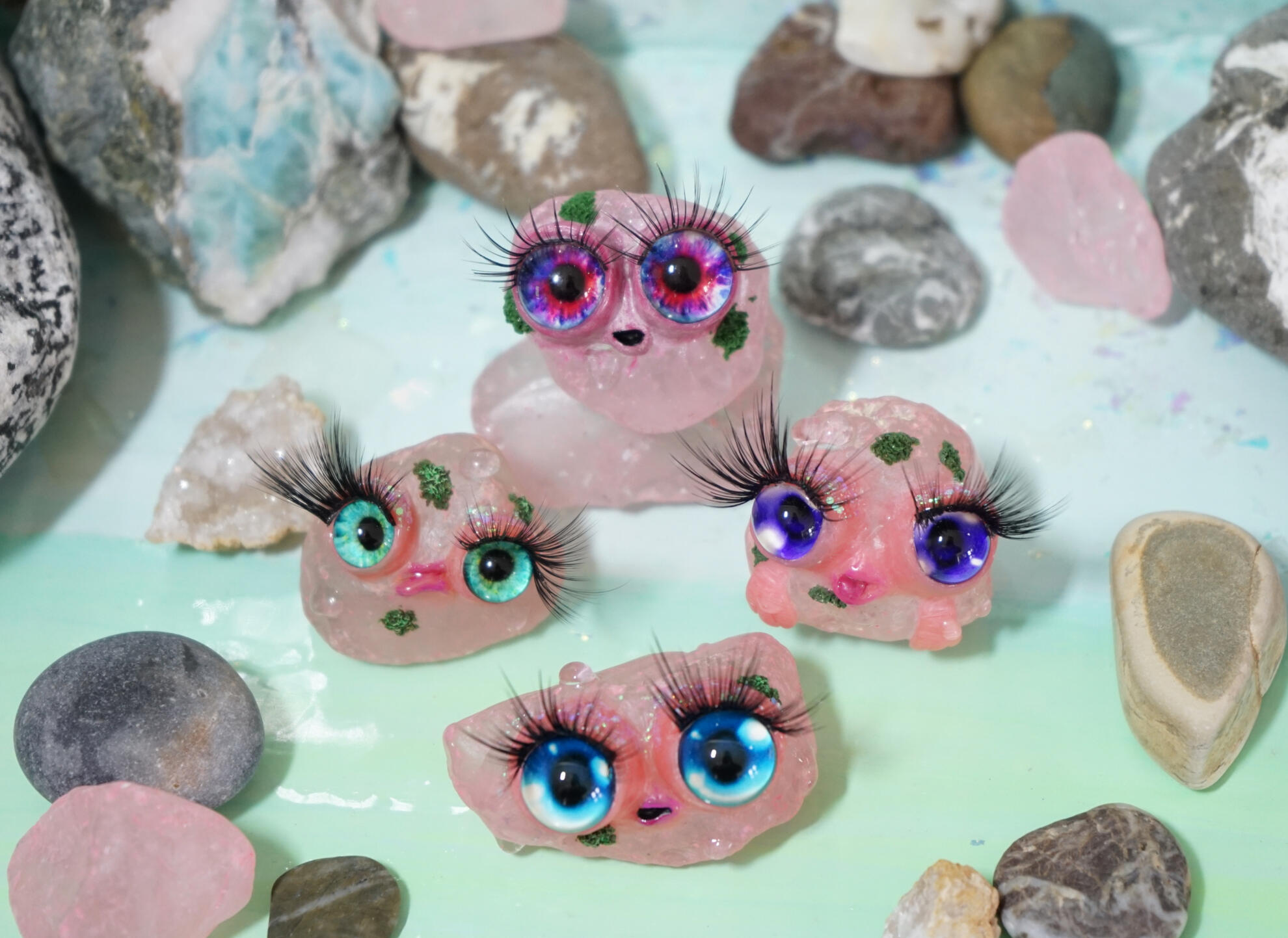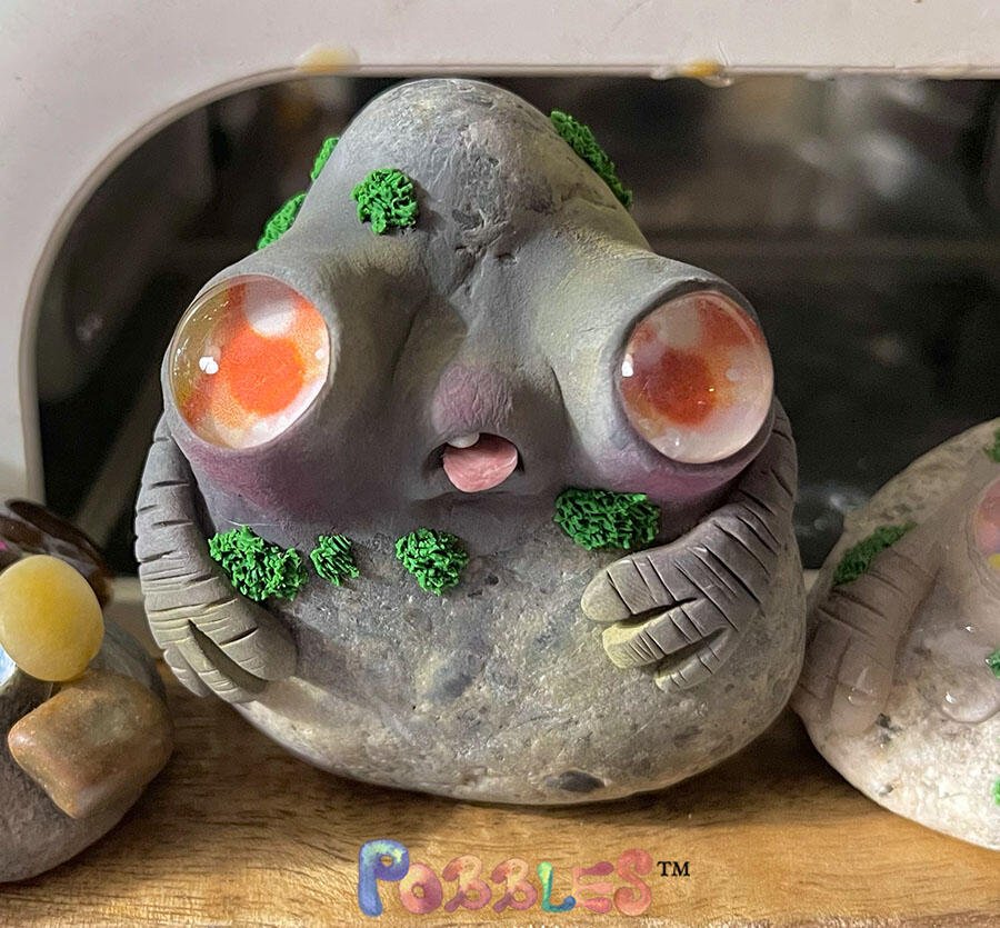 S.Clowette reminisces: “As a kid, I used to collect rocks from everywhere I went. I secretly carried rocks in my pockets wherever I’d go, even to school and I would put them under my pillow to sleep. I’ve always loved rocks! I also love water.”Two (healthy) obsessions: Rocks & Water - drowned in the artists’ whimsical imagination formed the Pobble world you see today! Pobbles are aquatic rock creatures living on the banks of crystal clear ponds, lagoons, and streams that have names, personalties, and big bubbly glass eyes. “The first Pobbles I used make would be very cute and heavily inspired by Manga and Kawaii culture. Now, they’ve become more oddly peculiar in their looks and I like that” says the artist.Each Pobble Rock is collected from a waterway directly by S.Clowette that she deems enchanting enough to source a Pobble stone. Then the stone is sculpted and handmade into a beautiful Pobble. Making every Pobble unique and truly One Of A Kind never again to be exactly duplicated. S.Clowette prides herself on originality, honesty, and kindness when creating her art. She prefers to operate her Pobble business on her own with no middle man or mass produced/mold casted products to ensure very genuine and special transactions that go beyond the value of money. “An experience - I want people to have. I want people to immerse themselves in The lucidly Wonderful World of Pobbles and leave the starchness of reality behind. Believe Pobbletopia to be a real place teeming with life and splendor. I believe Pobbles choose you, and it’s more than a purchase. Once you become a Pobble-lite your life is forever changed. When I’m creating Pobbles, It feels like astral paradise. I just love them so much, I transport to a realm of perfect serenity and happiness and I want others to feel like that too.” -S.Clowette.