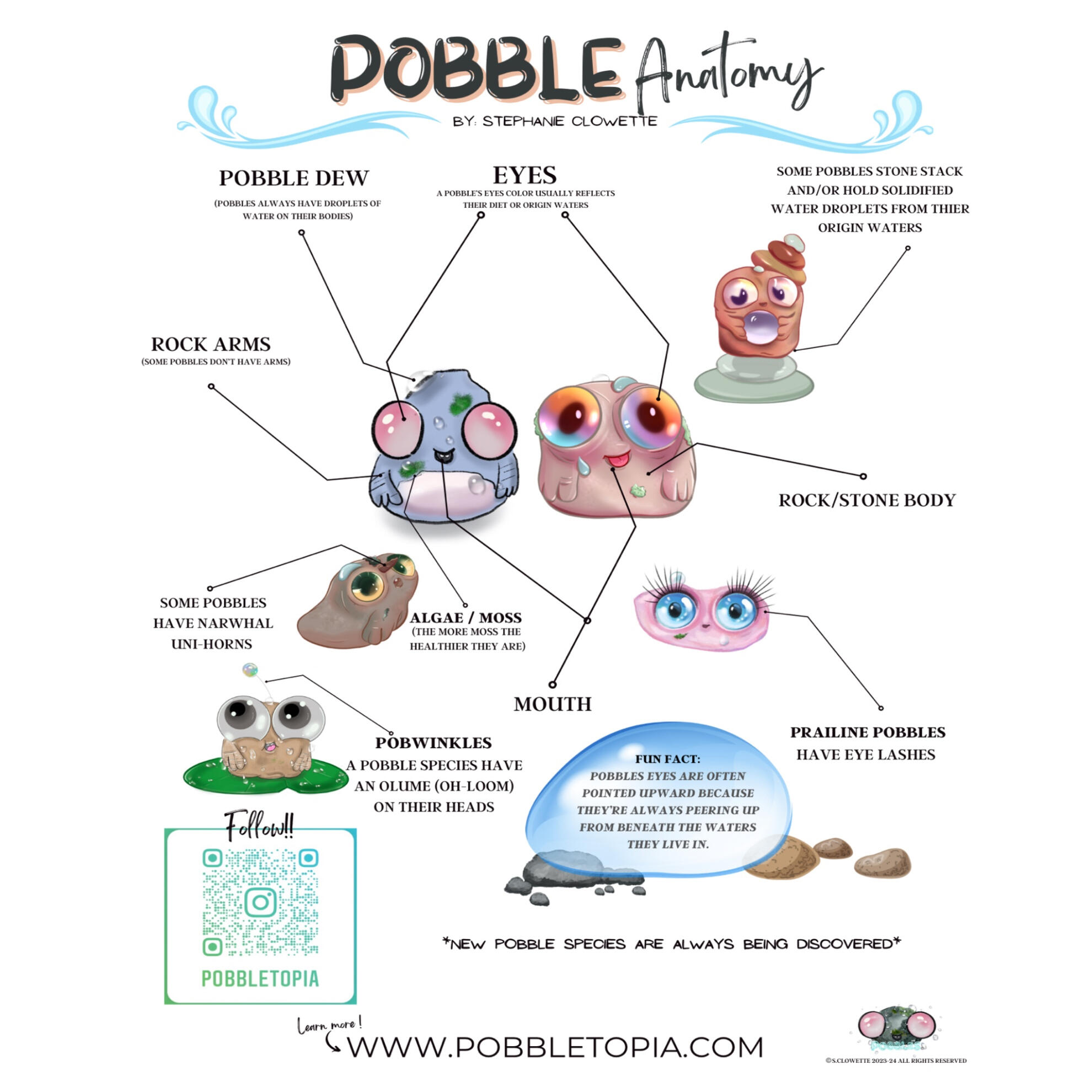 Pobbles have a number of unique anatomical traits necessary for Pobble survival/function. Get familiar and understand Pobbles better.Click the Pobble Anatomy photo to see it bigger, or hit the link below to explore Pobbletopia on Instagram.